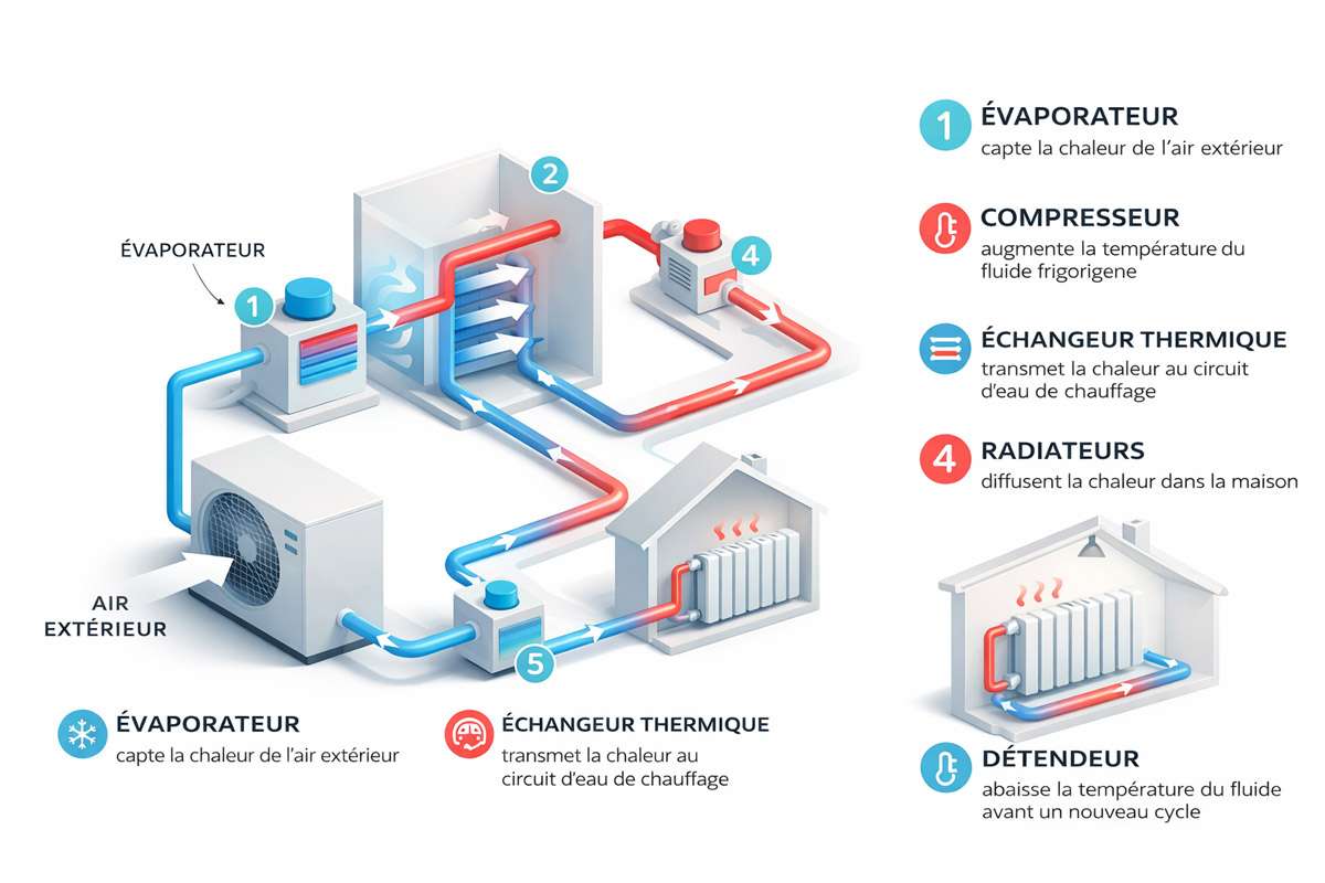PAC Air/Eau : transfert de chaleur vers votre circuit de chauffage (radiateurs ou plancher chauffant).